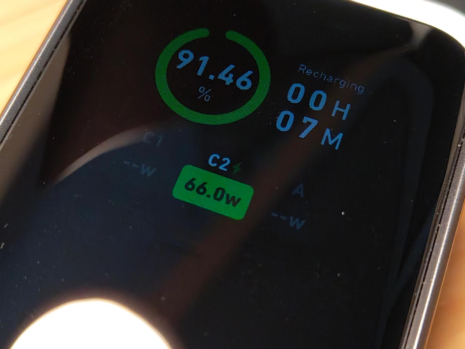 まずは1つのポートでどれくらい出力されるか、Anker Prime Power Bank (20000mAh, 200W)でチェックしてみたところ、66W程度出力されていました。