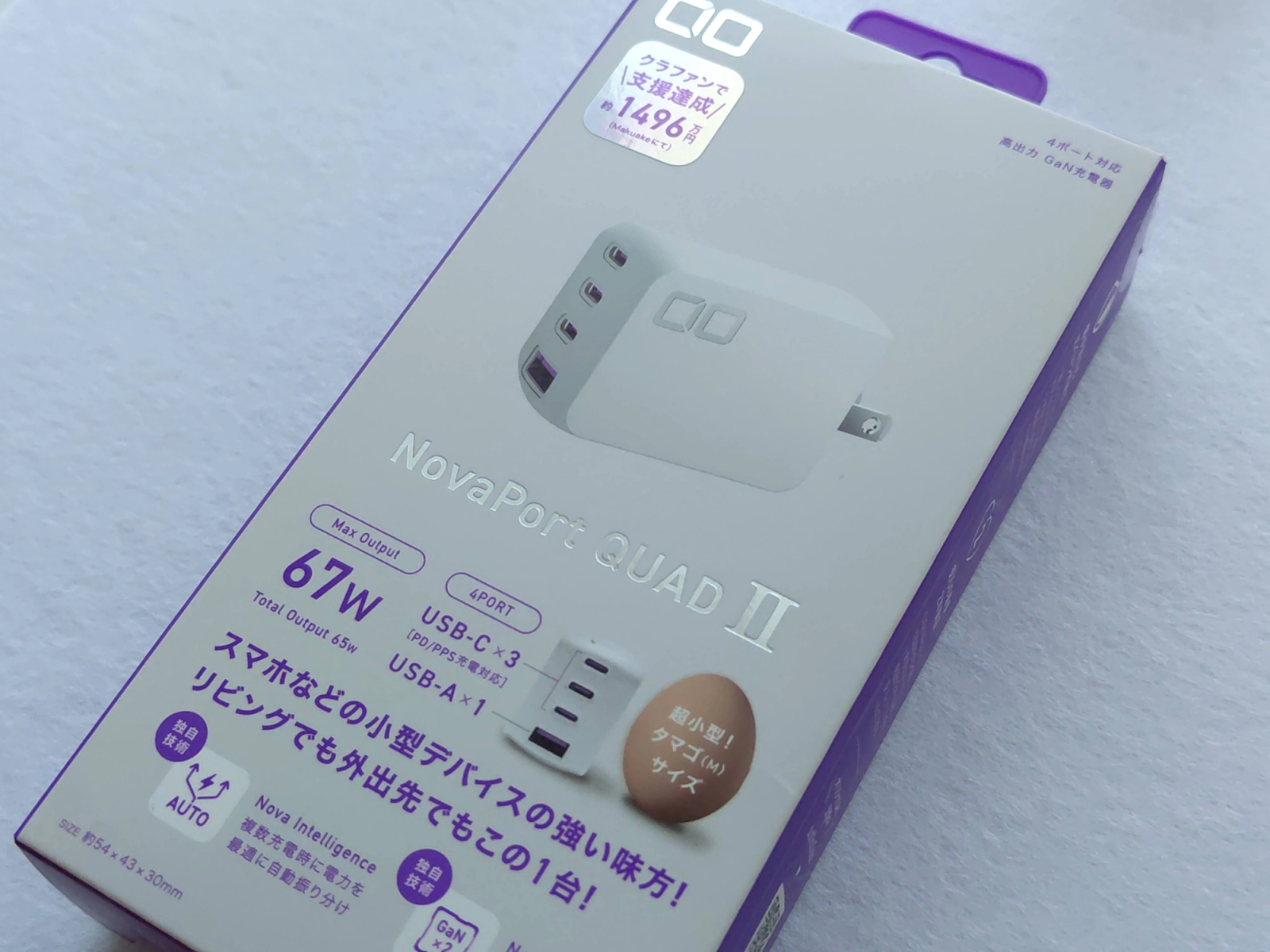 約 54 × 43 × 30 mmで、67W出力かつ4ポートを搭載した充電器の中では、世界最小級だそうです。(重さは約120g)