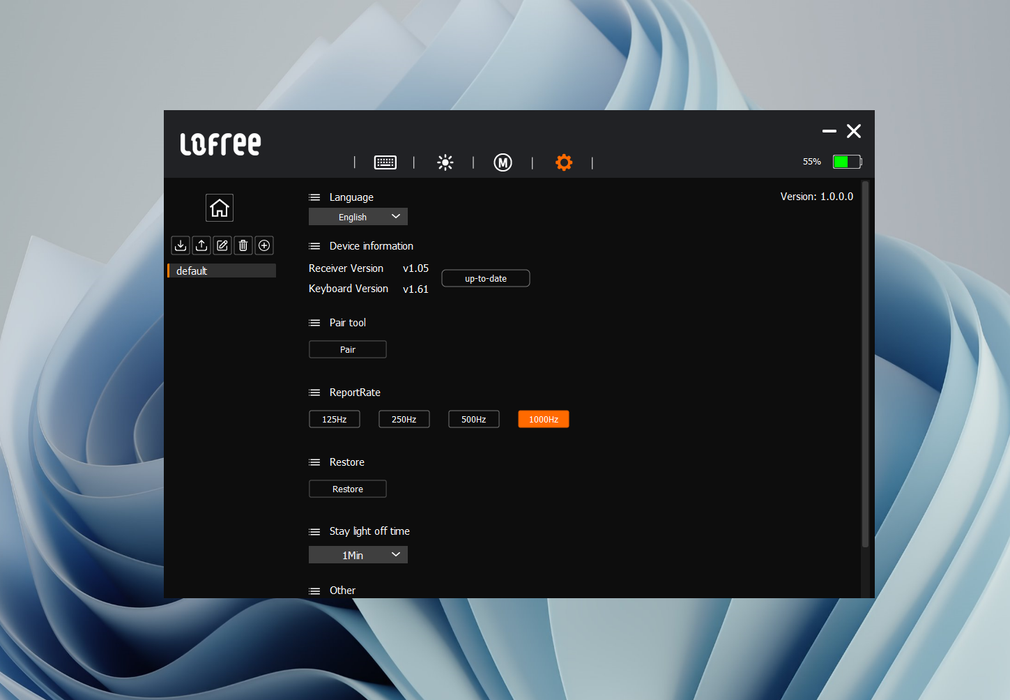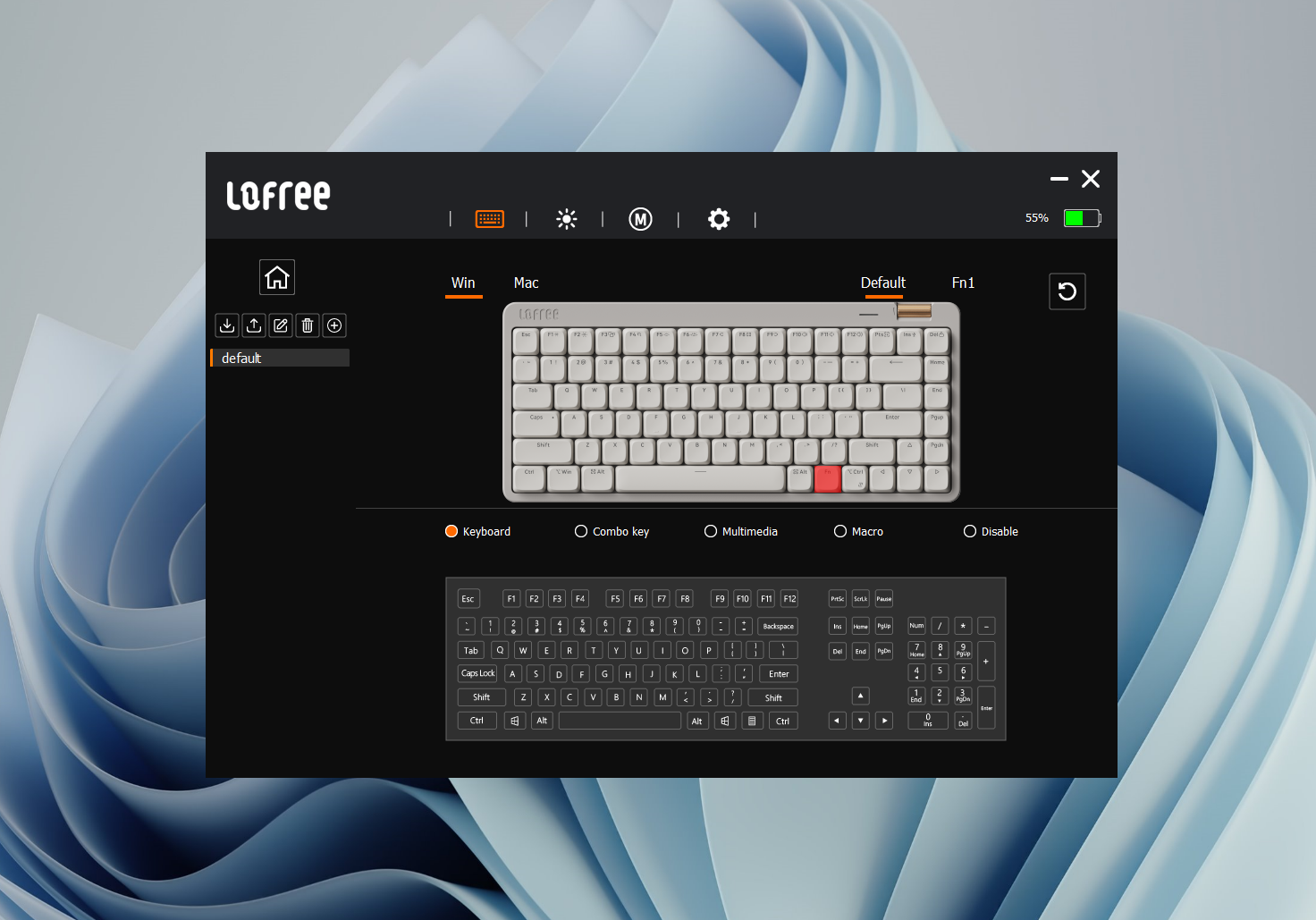 Flow Lite 専用ソフトウェアの「Lofree Key Mapper」をインストールすると、キーマップの変更だけでなく、バックライトの発光パターンやマクロを作成することもできます。