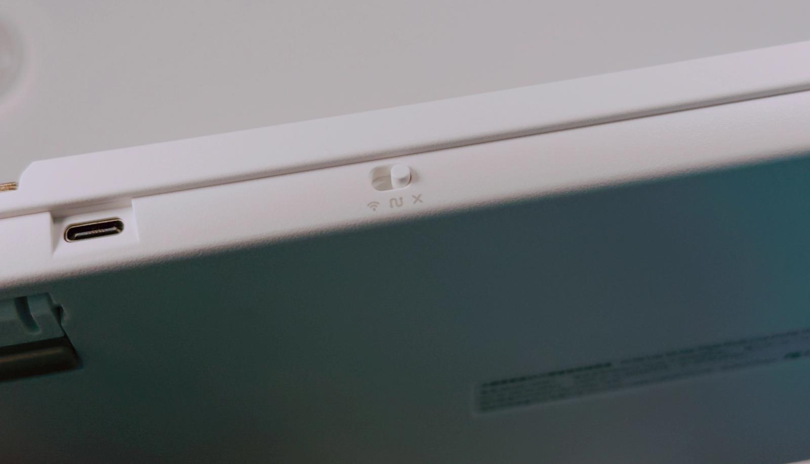 デバイスとの接続方法は、有線、2.4GHz無線、Bluetoothの3通り。本体側面に電源オフ・有線・無線の切り替えができるスイッチが搭載されています。