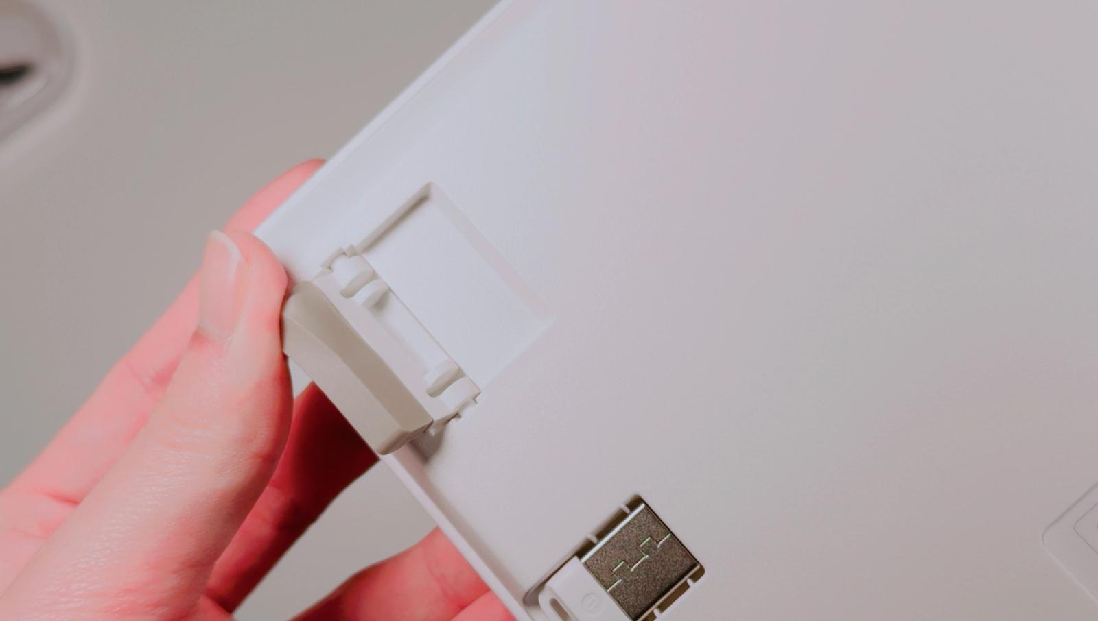 裏側には本体に傾斜をつけるための脚と、無線接続のためのレシーバーが収納できるようになっています。