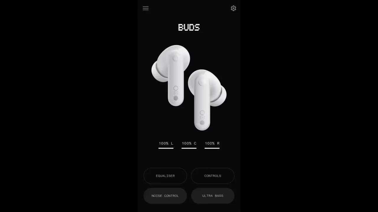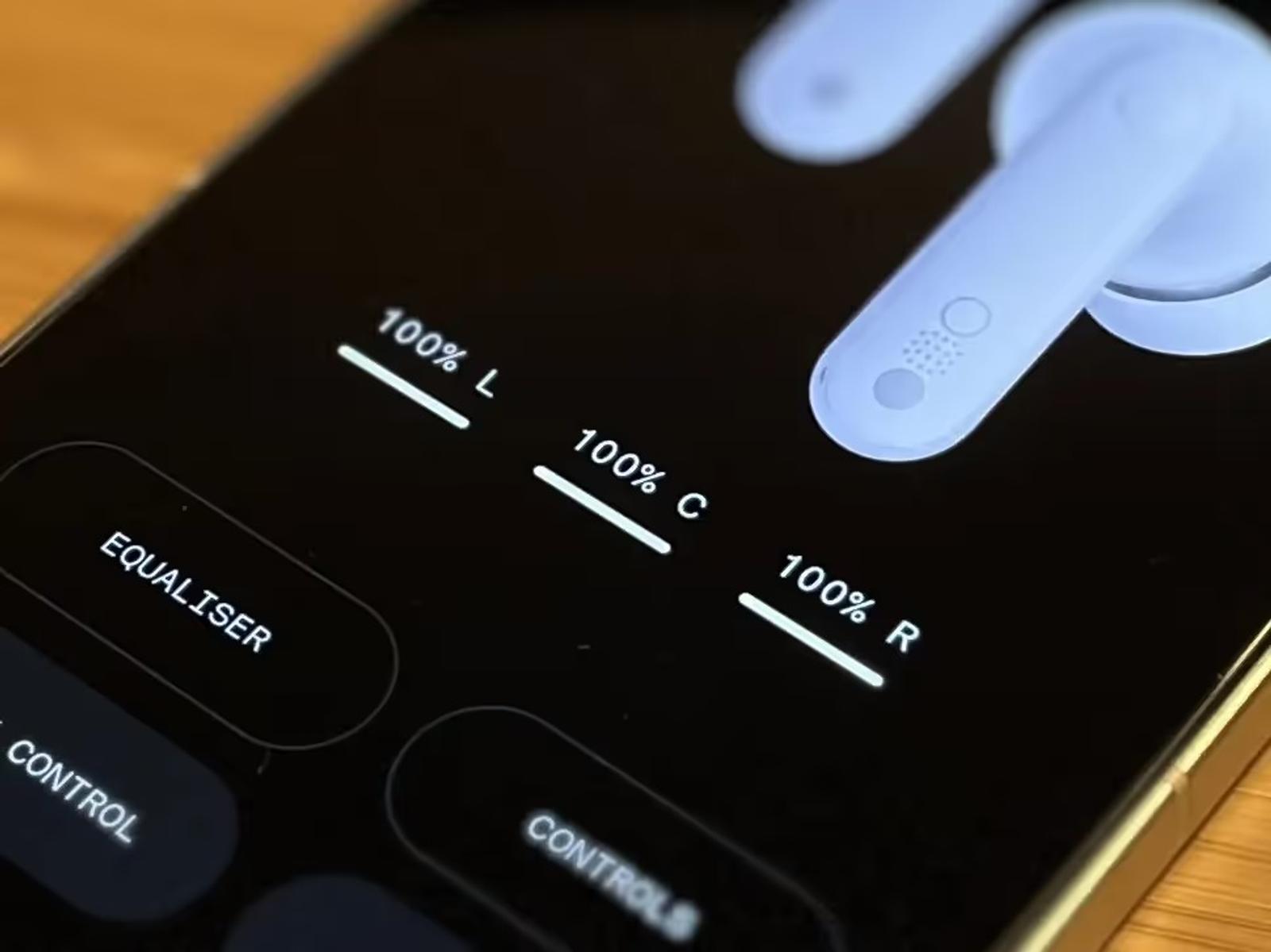 アプリはiOS/Androidで利用可能な、Nothingの「Nothing X」を使用します。アプリUIはシンプルで、上からイヤホンのイメージ、バッテリー残量、EQやANC設定ボタンという構成になっています。フォントなどはNothingらしいものが使われていますが、レイアウトにはあまり癖がなく、全体的に使いやすいです。