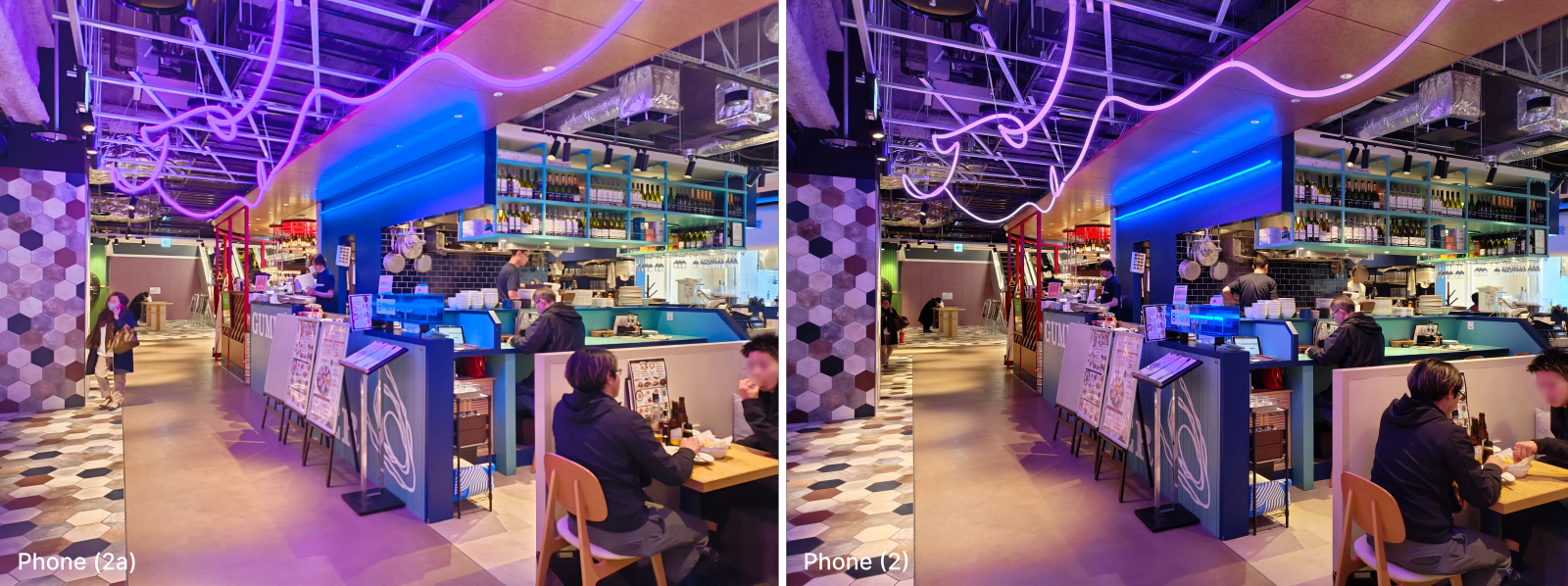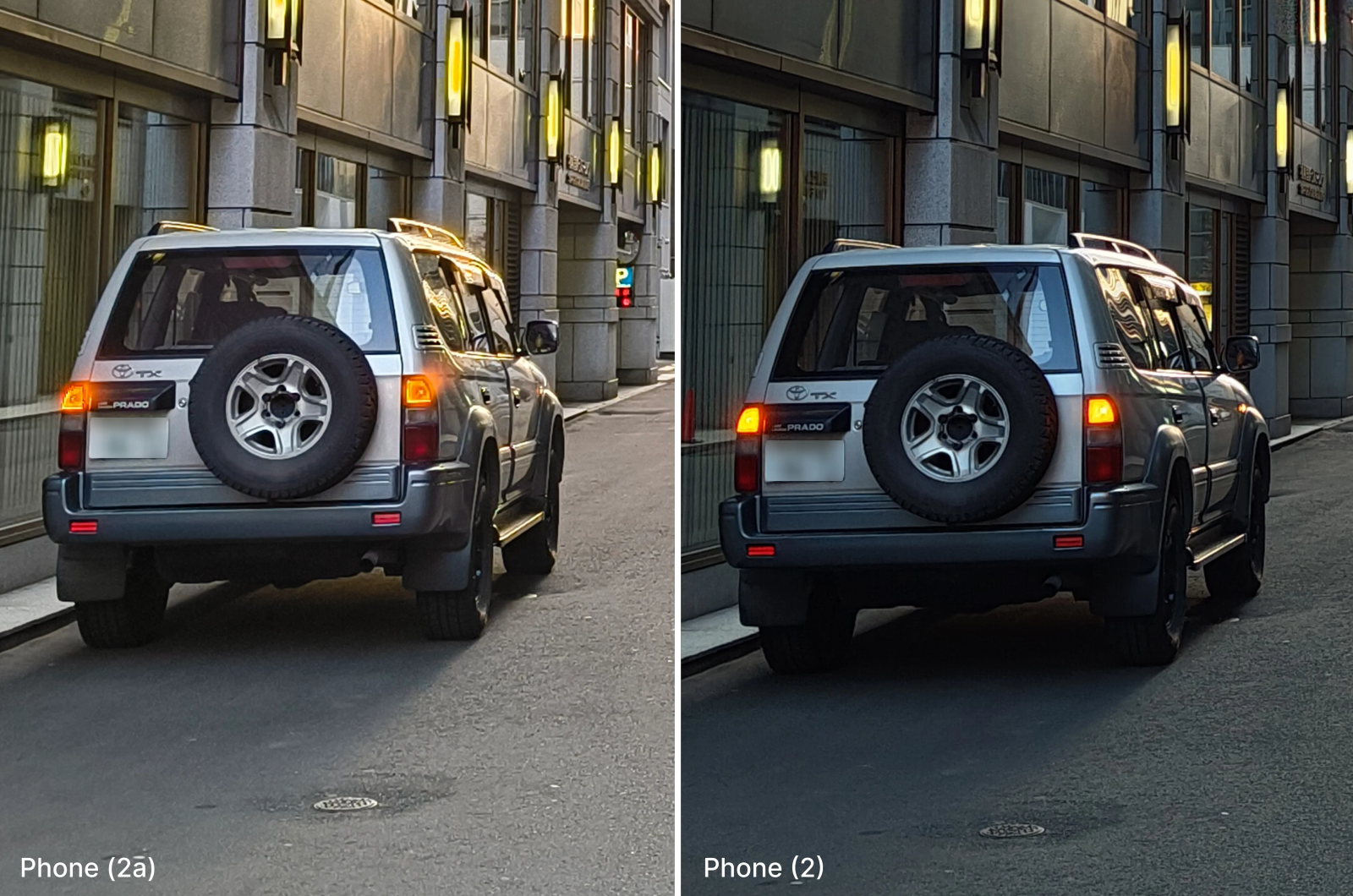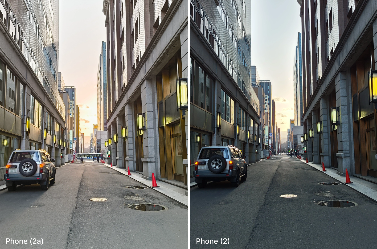 スペック上の画素数はどちらも同じですが、質感やディテールはPhone (2)に軍配が上がりますね。Phone (2a)は低照度環境が苦手なようです。