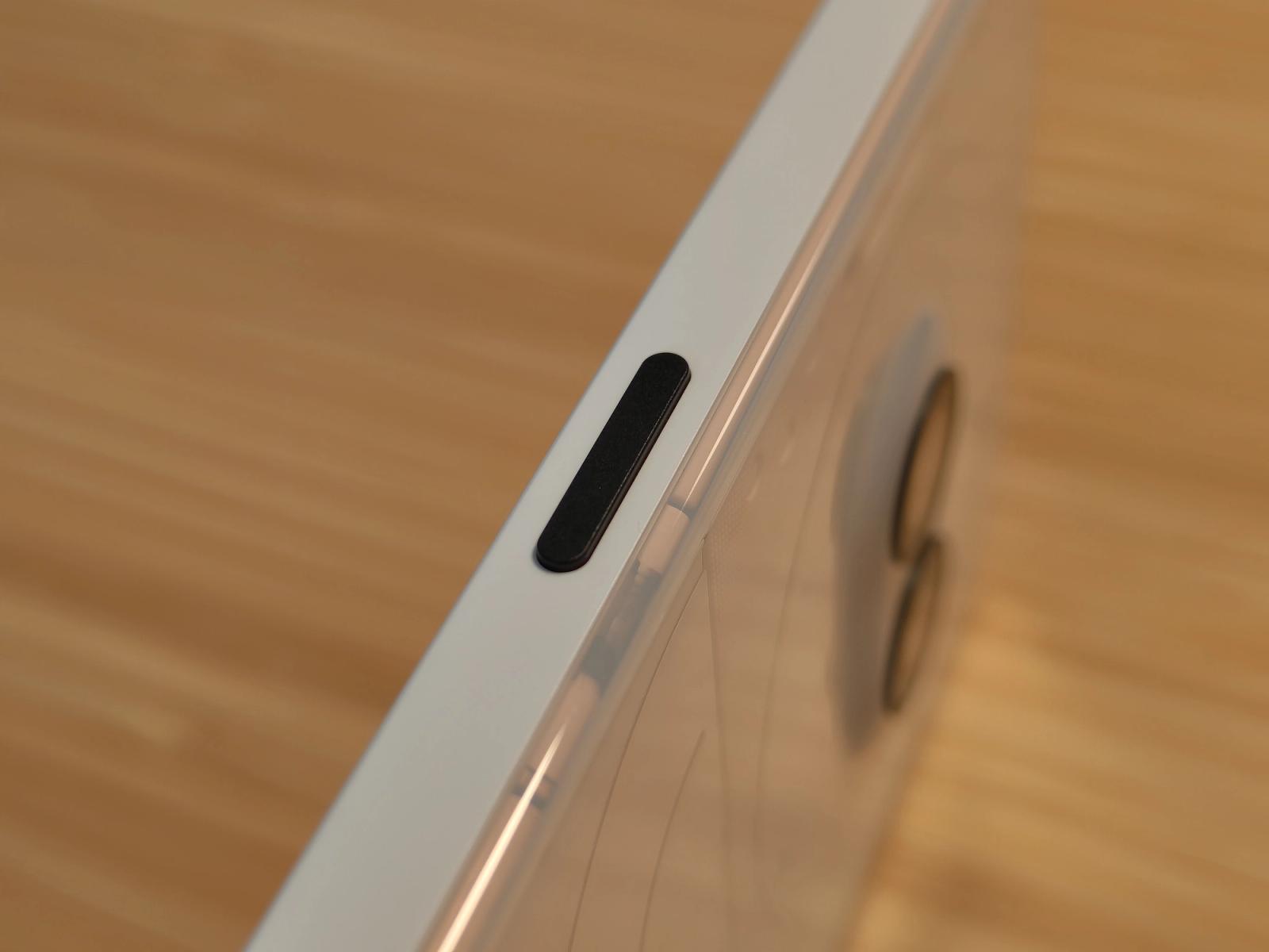 筆者が購入したカラーのミルクは、フレームは白、ボタンは黒のアクセントが付いています。背面パネルは樹脂製で、透明ですが少し白濁しています。 ブラックカラーもあります。
