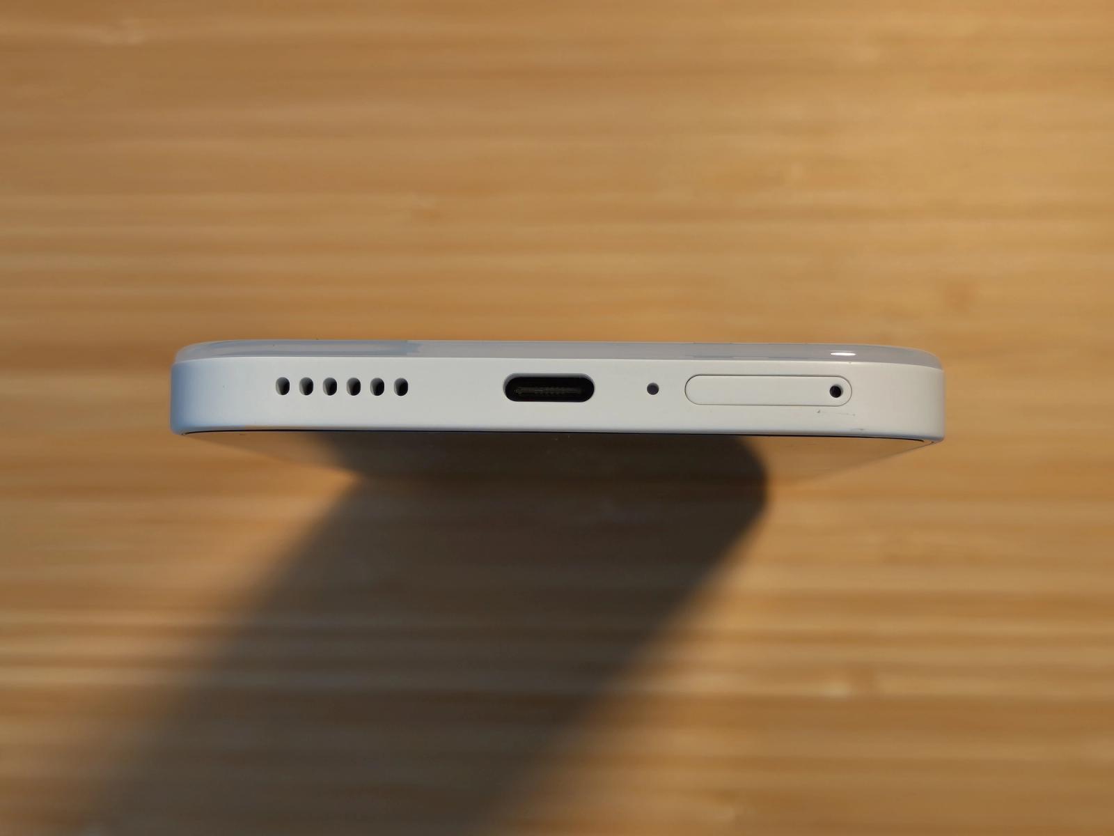 ちなみに、フレームも樹脂製ですが、ボタンはアルマイト処理が施されたアルミニウムです。去年発売されたPhone (2)と比べると、Glyph Interfaceも少なく簡素化されていますが、背面の白濁も相まってか、全体的に柔らかい印象があります。