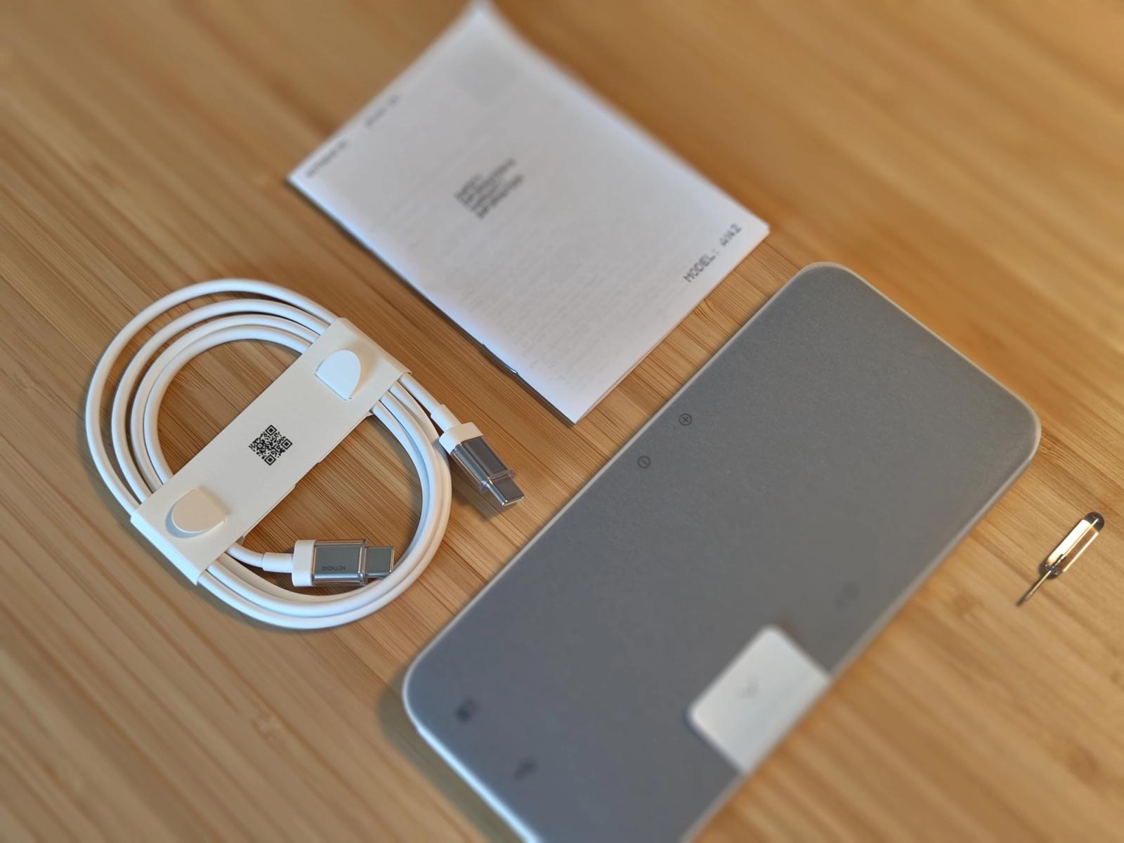 付属品はUSB-Cケーブル、SIMピン、マニュアルのみです。ケーブルやSIMピンはスケルトンデザインで美しいですね。
