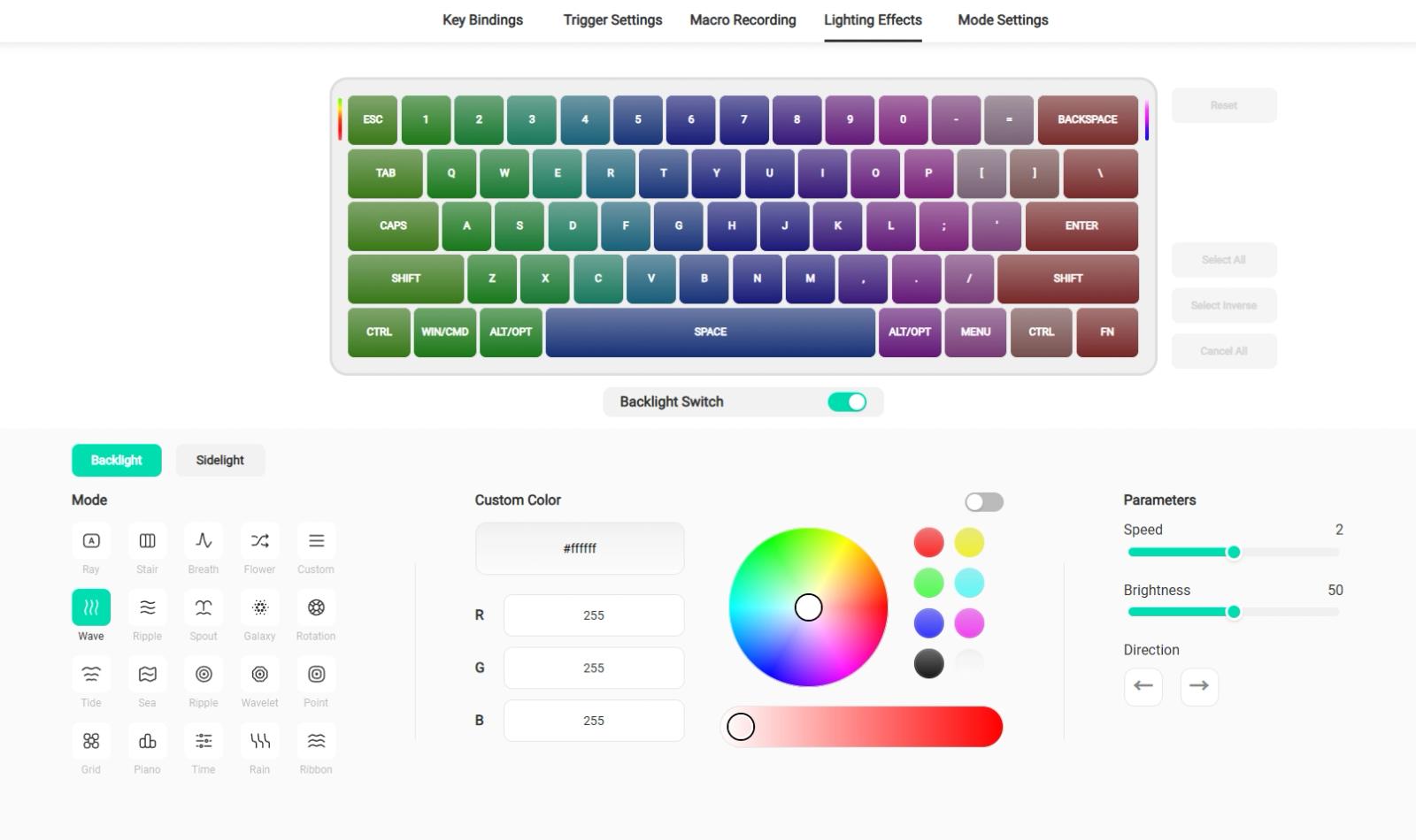 ちなみに、バックライトの色やエフェクトもドライバーから詳細に設定できる。もちろん、消灯することも可能なのでご安心を。