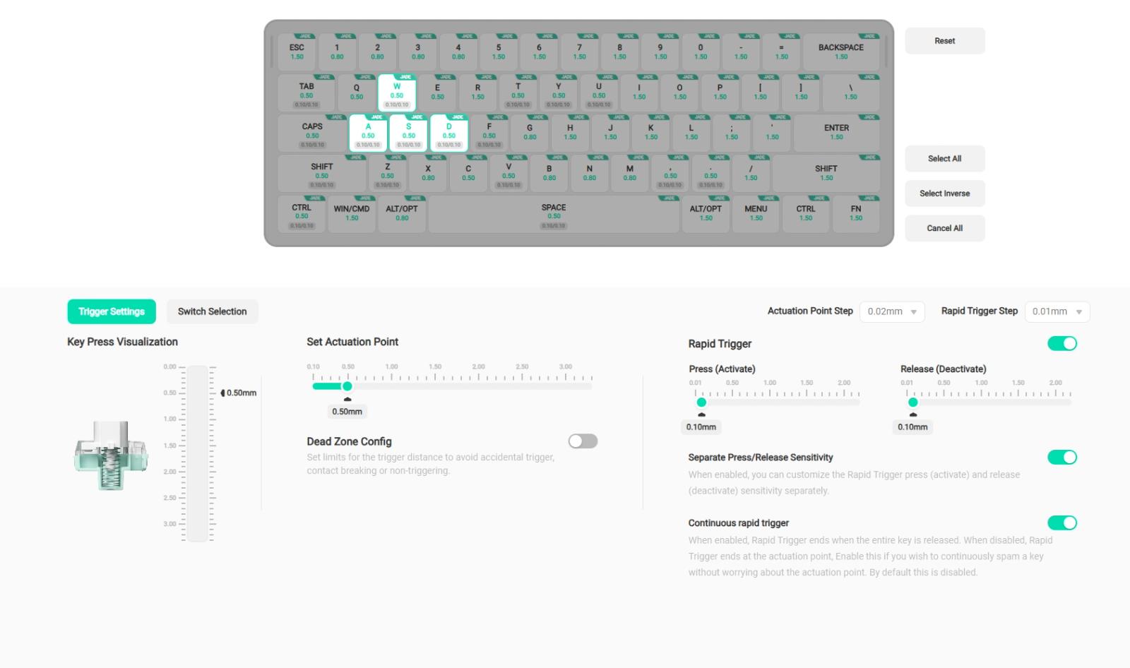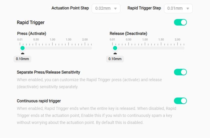 実際に設定を開いてみると、アクチュエーションポイントは0.02mm、ラピッドトリガーは0.01mm単位で設定することができるようだ。