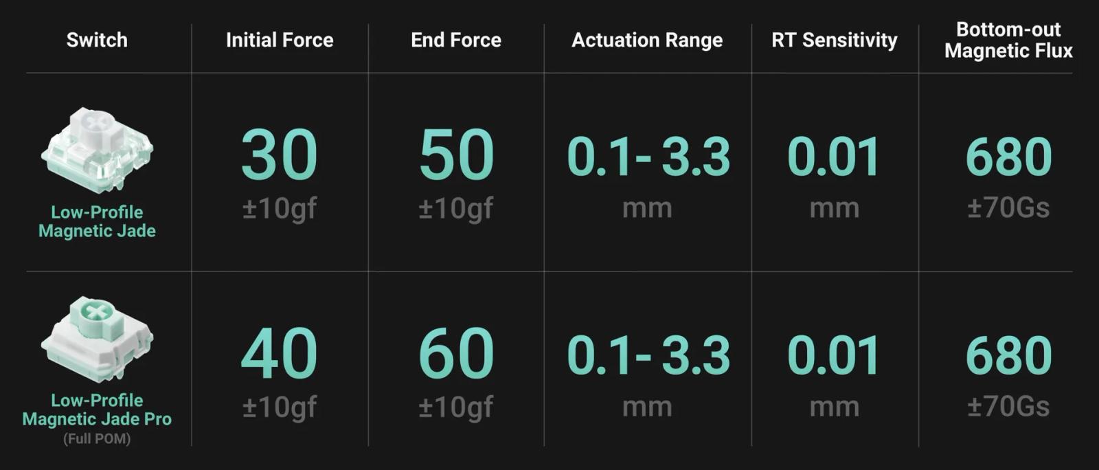 本シリーズに採用されているスイッチはGateron製「Low-Profile Magnetic Jade」と「Low-Profile Magnetic Jade Pro」の2パターンある。