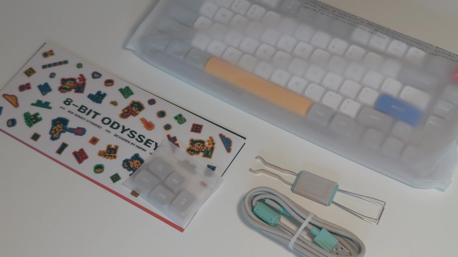 開けてみると本体、8bitなステッカー、キーキャップ、プーラー、マニュアルが同梱されていた。