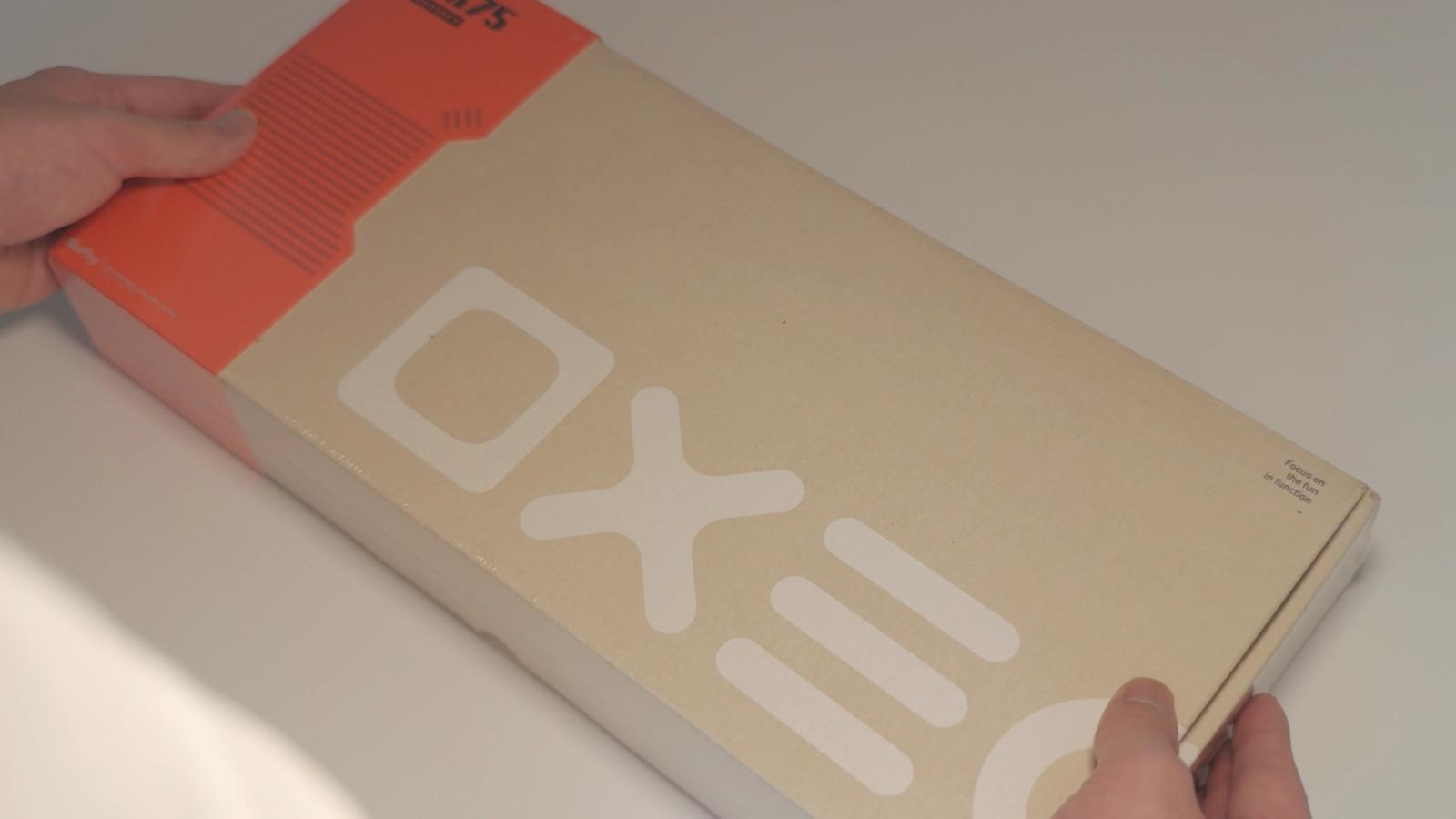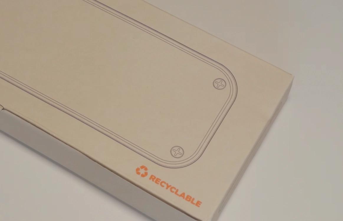 箱は「エコな素材感」ある淡白な見た目で、あのカラーリングのキーボードが入っているようには思えない。