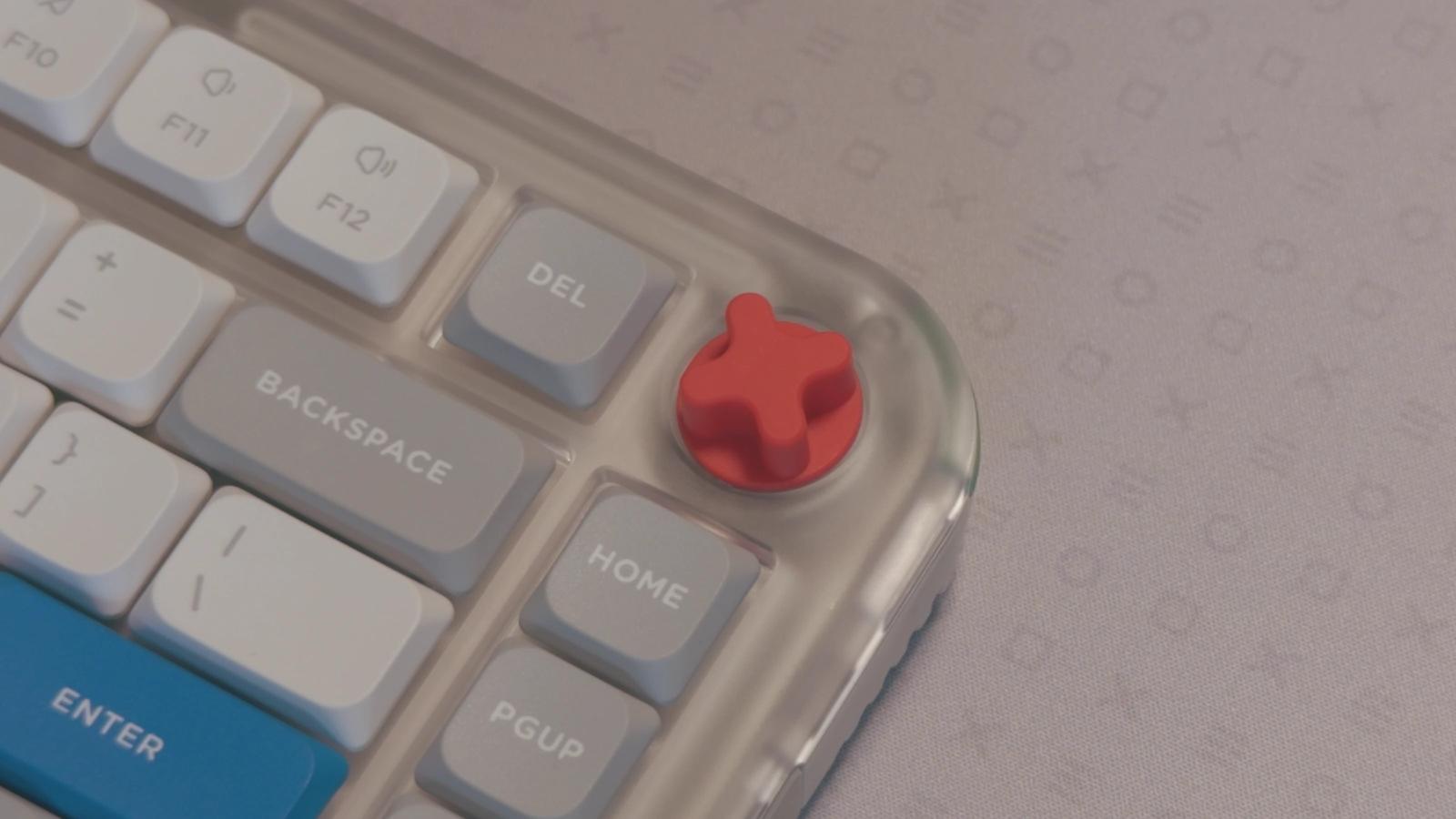 デザインはスケルトンケースにカラフルなキーキャップ、75%レイアウト、赤いノブやインジケーターLEDがアクセントとなり、見た目にも楽しい。