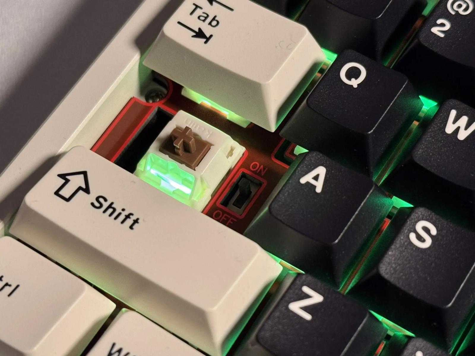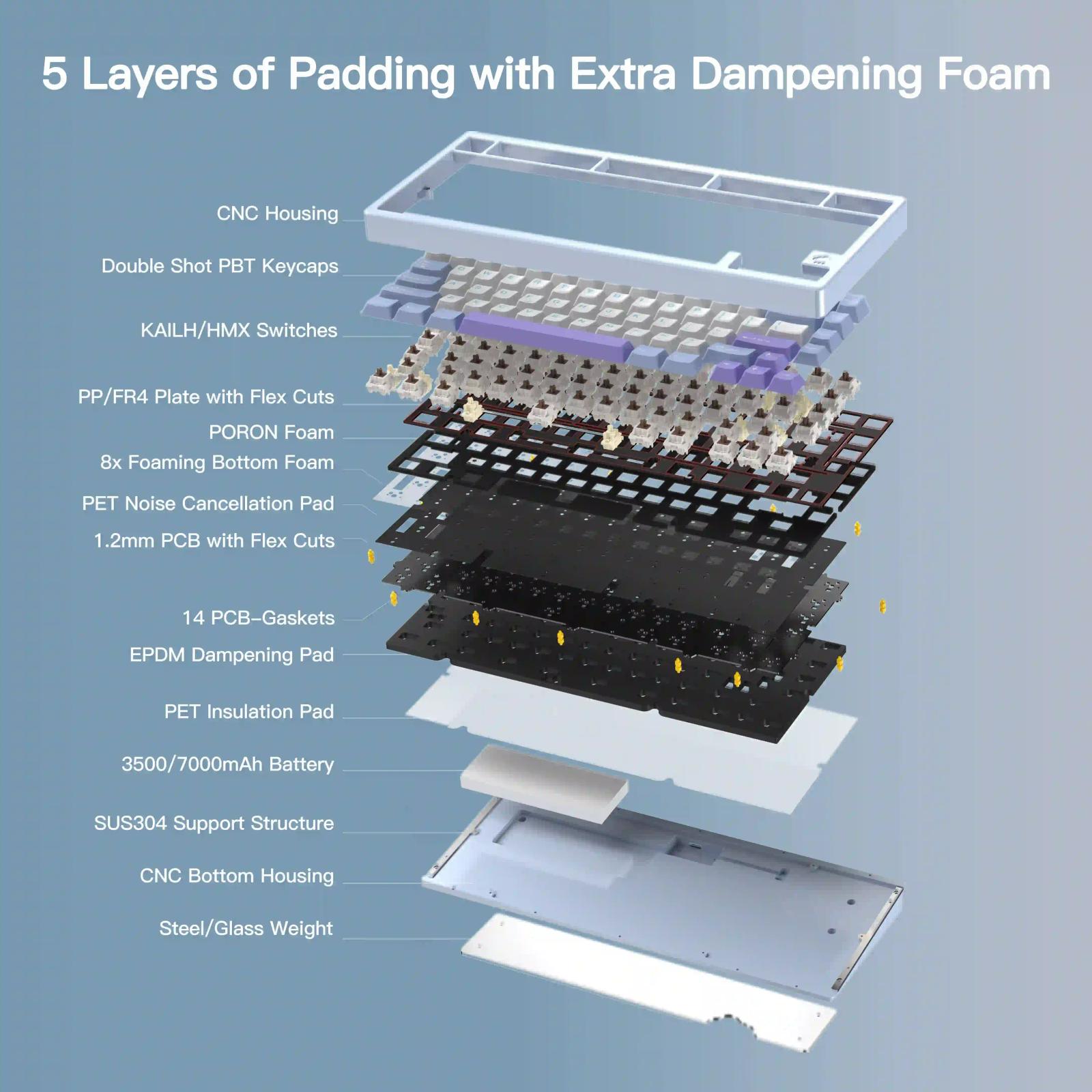 本キーボードはガスケットマウントが採用されていて、5層のフォームとアルミケース、ルブ済みのCocoaスイッチで構成されている。