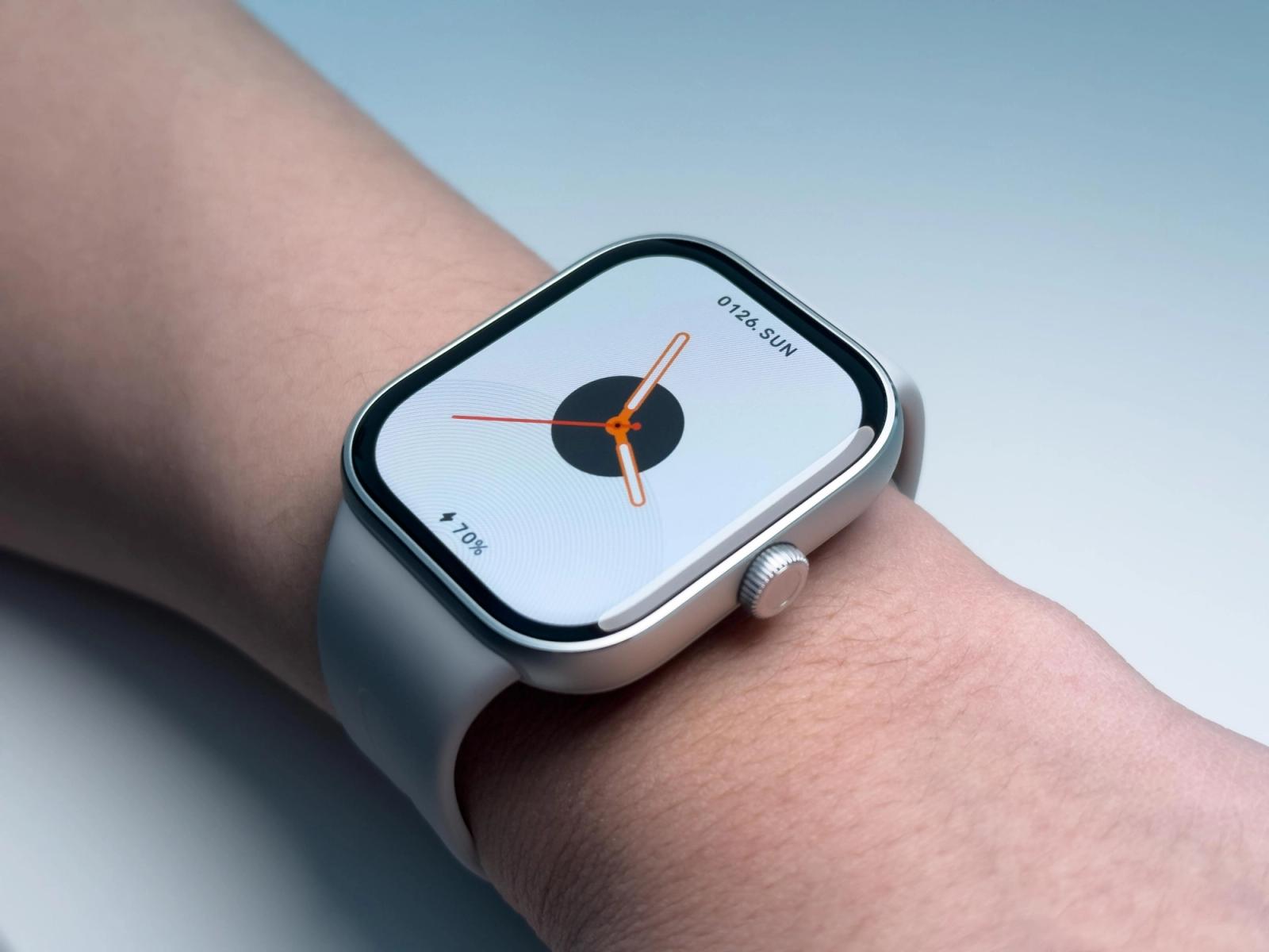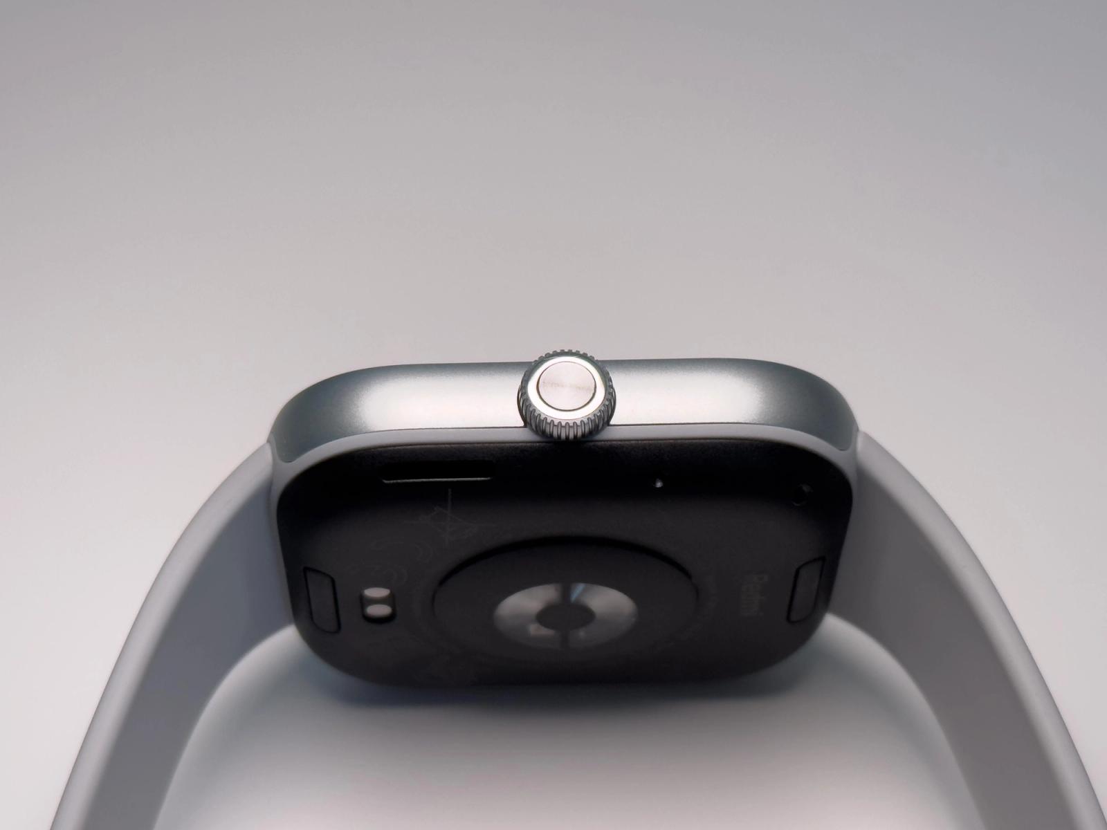 スクエア型の筐体は、Apple Watchを彷彿とさせる洗練されたデザインです。側面に備わっているクラウンは実際に操作可能で、回すと心地よい触覚フィードバックが得られます。