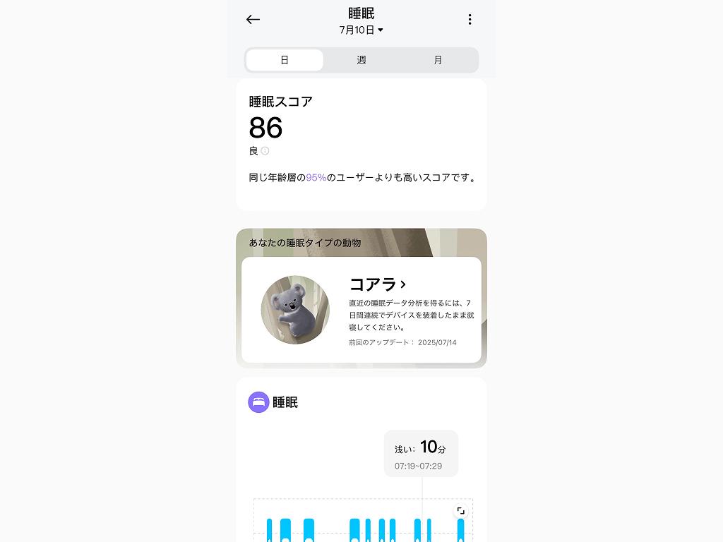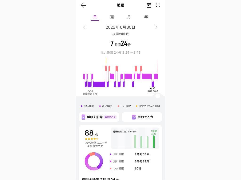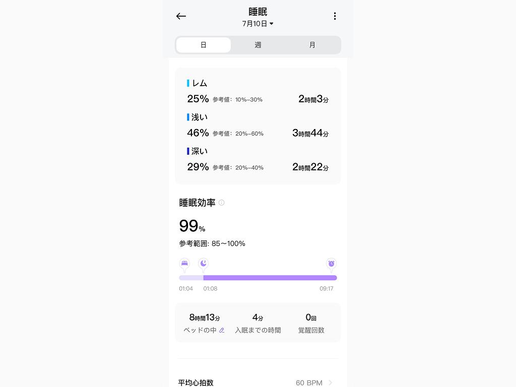 体感と睡眠スコアのズレも少しあった。目覚めはあまり良くなく、疲労感も残っていたため、実感に対してスコアはやや高めだった。