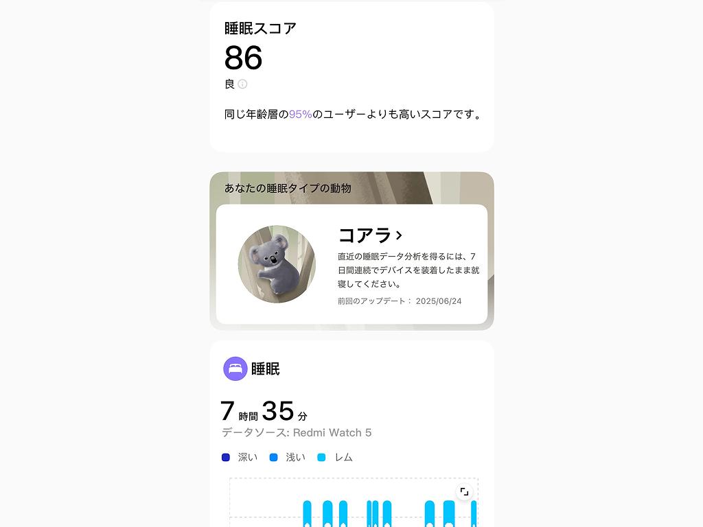 おまけにRedmi Watch 5も測定してみたところ、睡眠スコアは86でDeepの割合がやや多かった。平均心拍数と呼吸スピードはSmart Band 10と同じ。