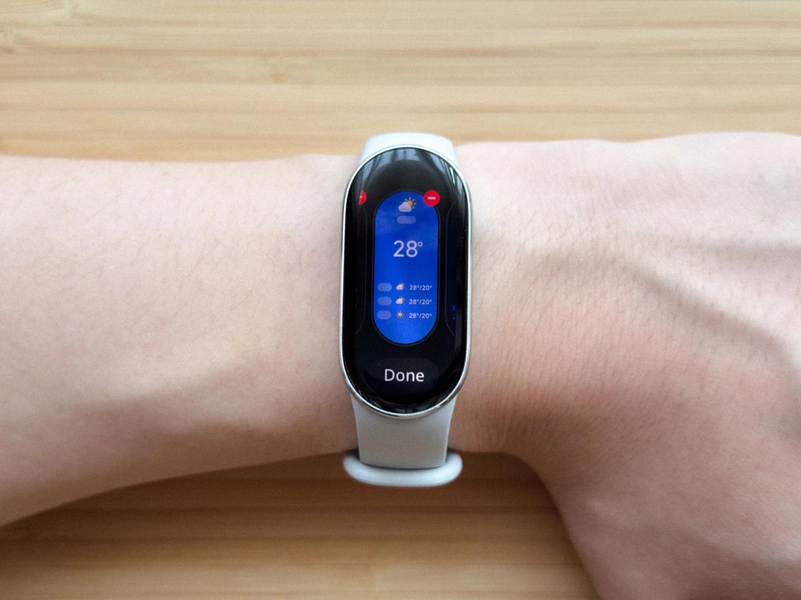 電源を点けて最初に気づいたのは、ベゼルの細さ。画面占有率は前モデルのSmart Band 9比で7%増加している。前モデルは祖父に譲ったため手元にないが、画面の大きさとベゼル幅の変化は十分に実感できる。