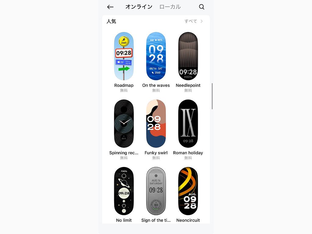 ウォッチフェイスの変更もアプリから手軽(フェイスダウンロード後はバンド本体でも切り替え可)。