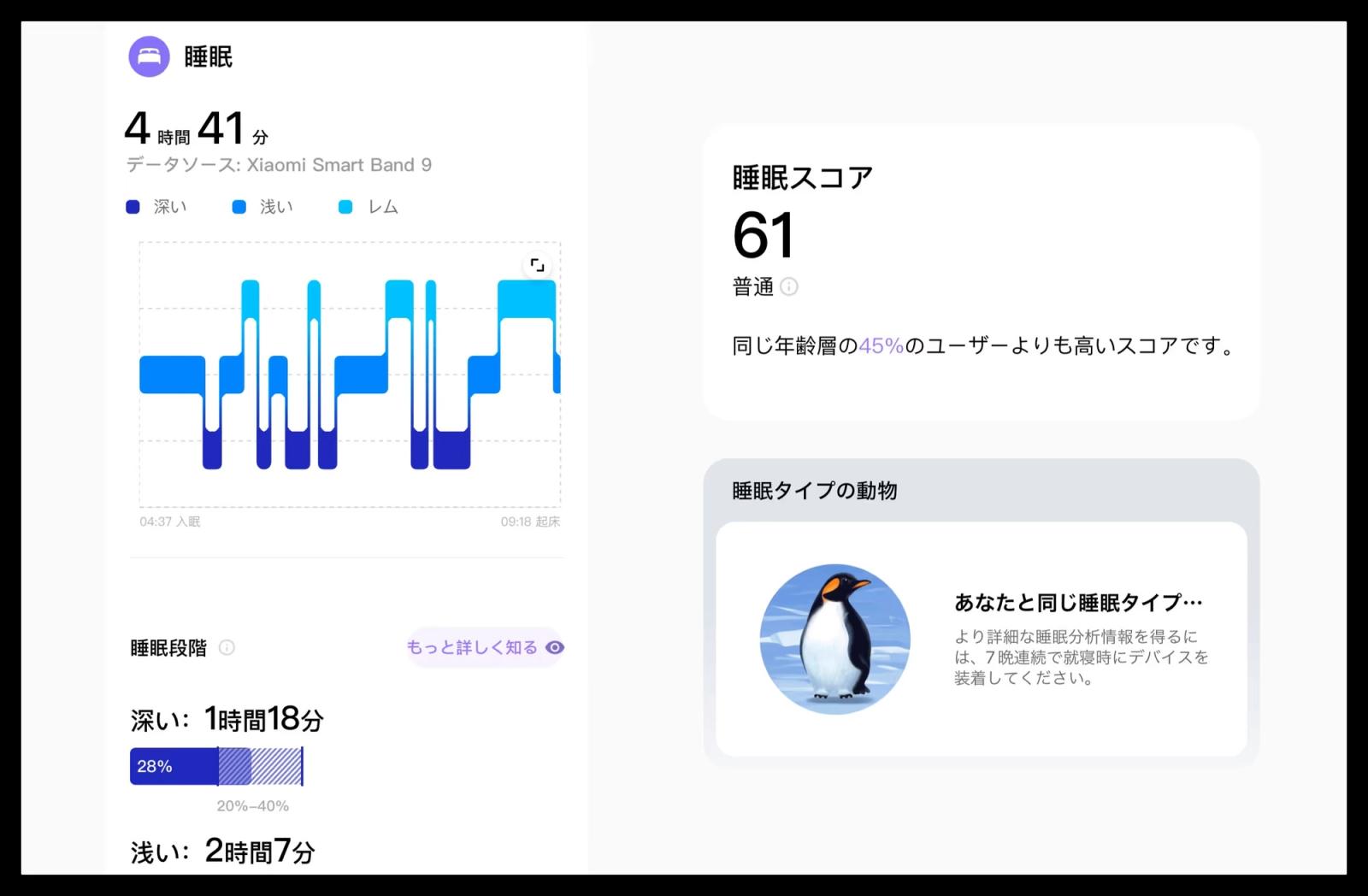 データはスマートバンドでも一部確認できますが、詳細なデータは公式アプリのMi Fitnessで確認します。